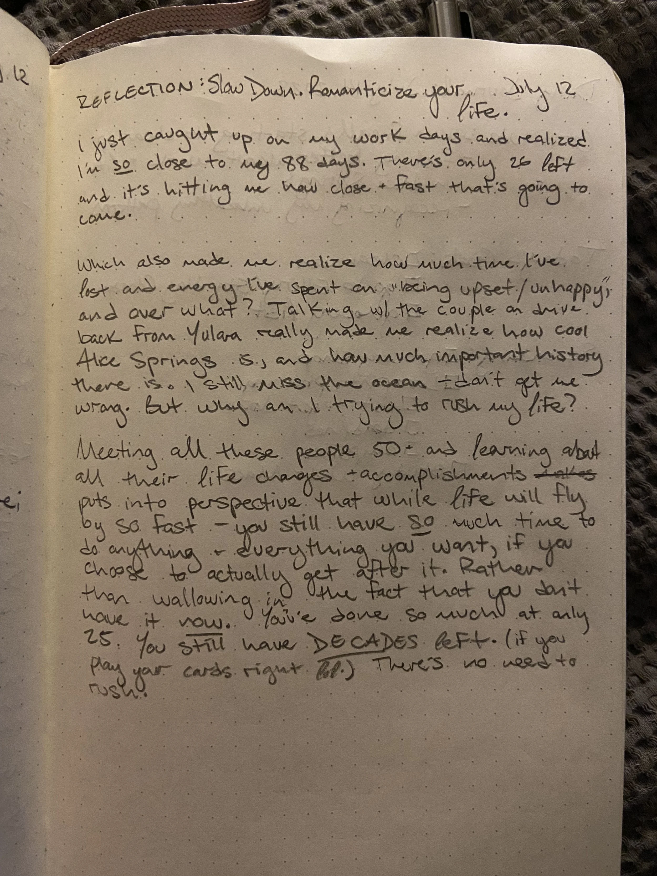 The rest of the afternoon was a very healing one. I spent a good chunk of time reading and taking a solid (and much needed) nap, and then got my butt in the sun for some yoga and journaling in the park across from the hostel. I realized it had been such a long time since I’ve done any of these things and how desperately it was needed. I also managed to find some clarity on a lot of the “stuck” feelings I’ve been experiencing the past few weeks – which if you’ve been following along the past few posts, you’ll know how much this has been affecting me and my time here in Alice Springs. I’m actually going to share one of the entries I wrote when finding this clarity. I think the overall theme that sticks out most for me is: stop trying to rush life. Yes, it moves fast, but I need to stop trying to make it move faster (whether that’s intentional or not).